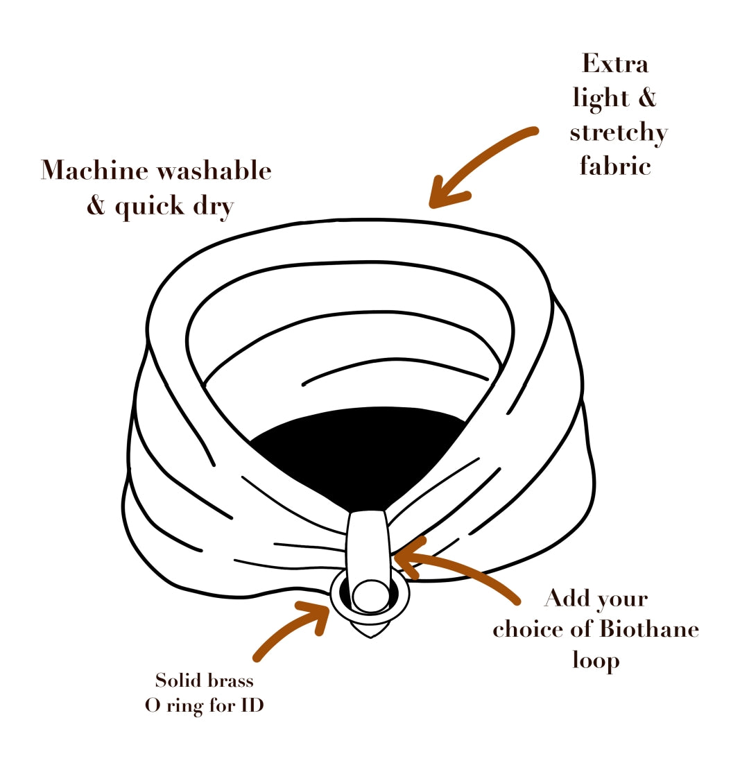 - Solid brass O ring to attach your ID tags to, fixed with a biothane loop to the scarf.